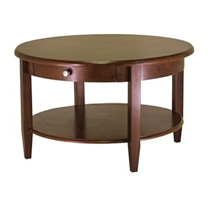 Clean, classic lines and a rich Antique Walnut finish make Winsome Wood's Concord round coffee table a fine addition to a formal living room or well-tailored den. The roomy 30-inch top features gently rounded edges and perches on a simple apron with a concealed storage drawer. Below, the bottom shelf makes a nice display space for magazines, oversized books, or collectibles. Crafted of solid wood with a chrome-colored pull, the table is des... Read More...